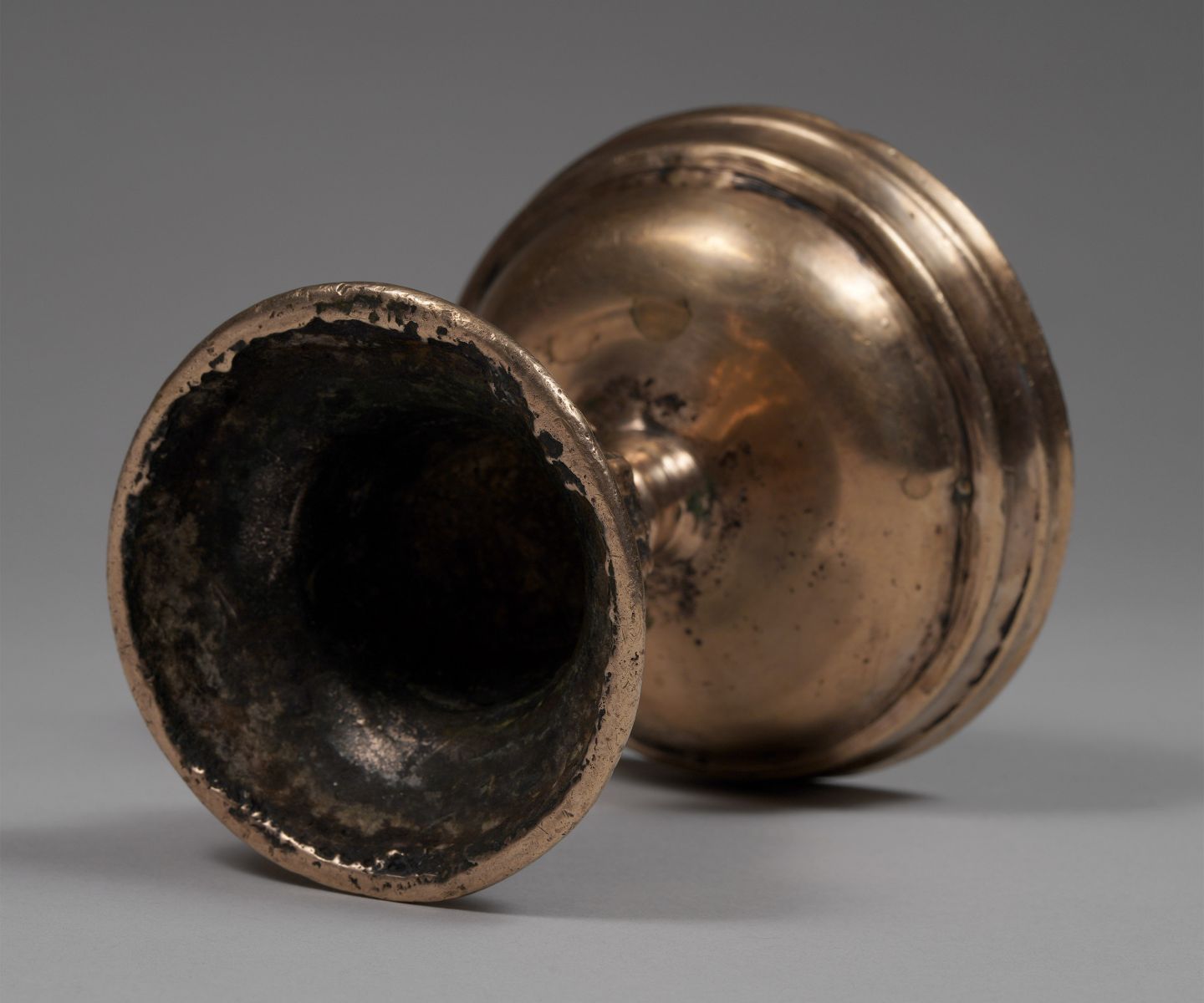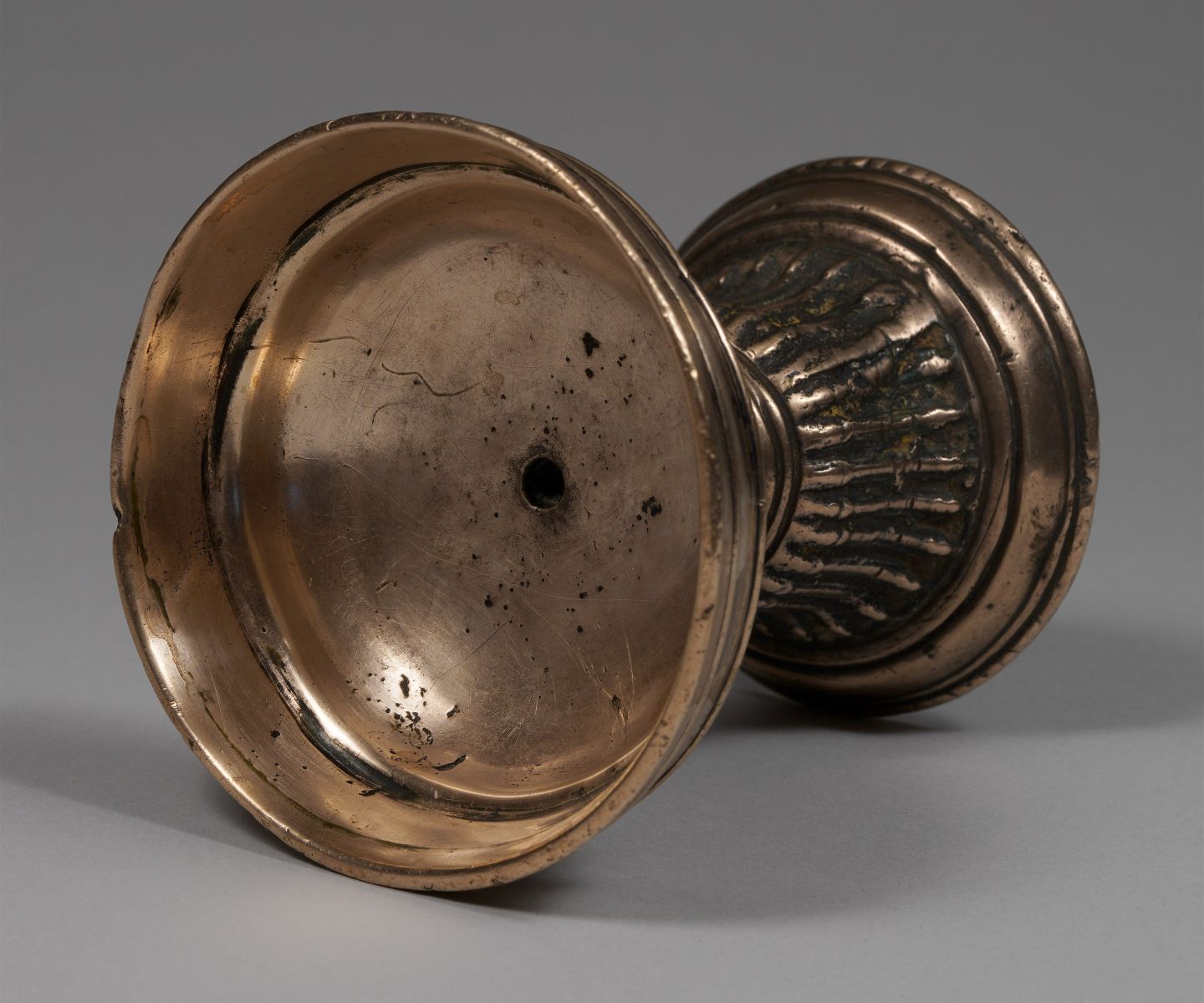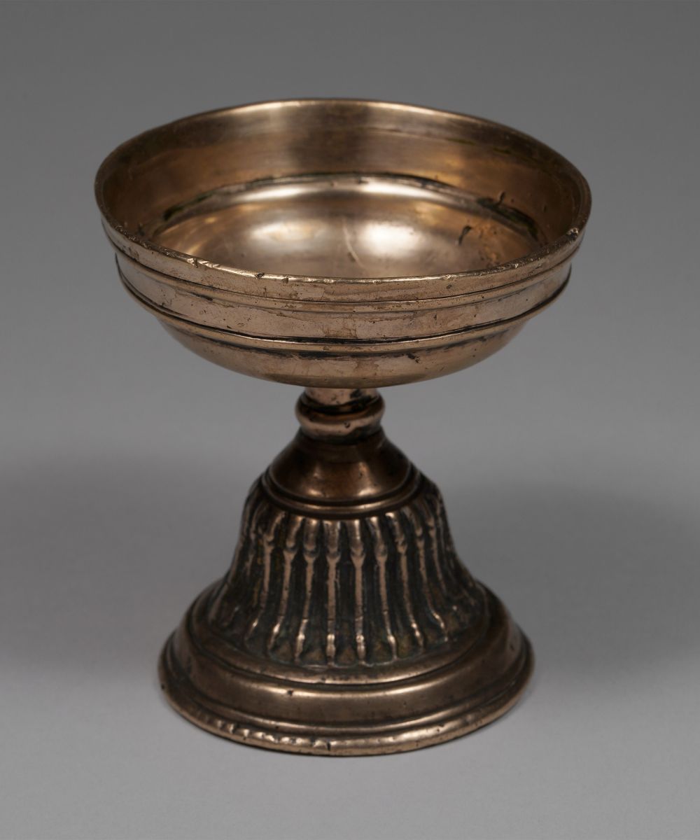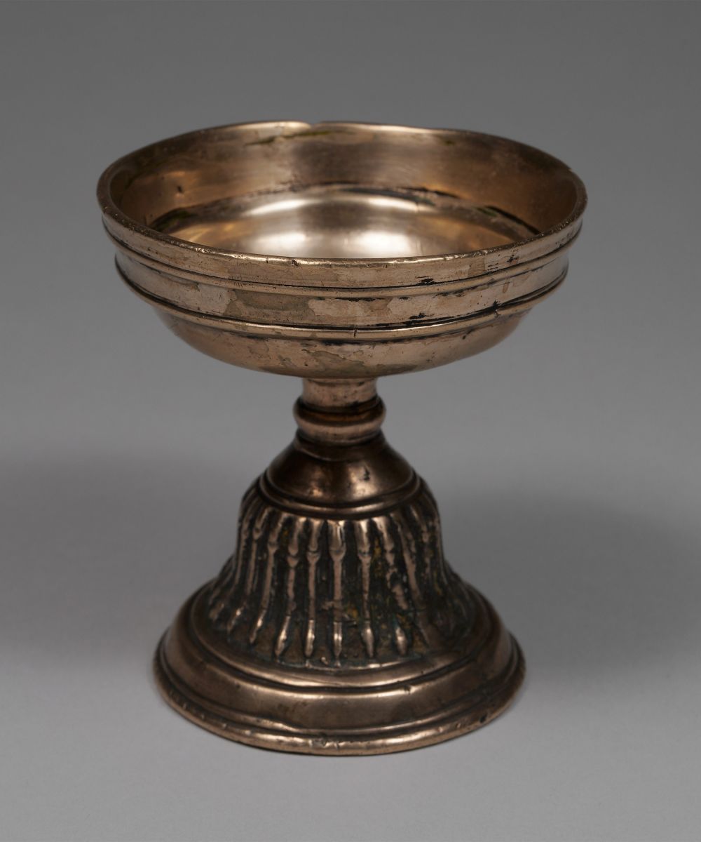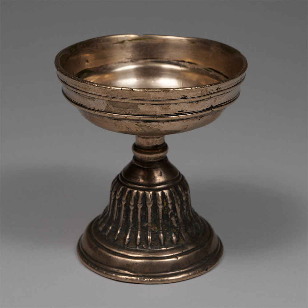 An offering vessel with an unusually shallow and wide bowl. It glistens with patina of ritual usage.