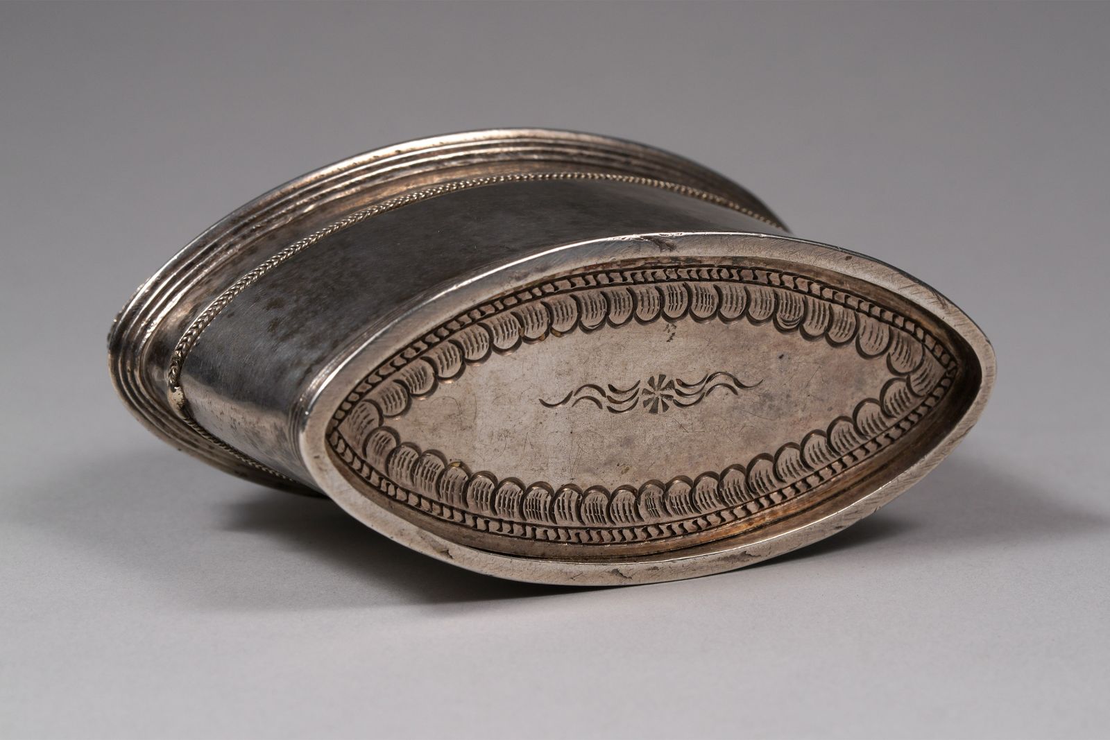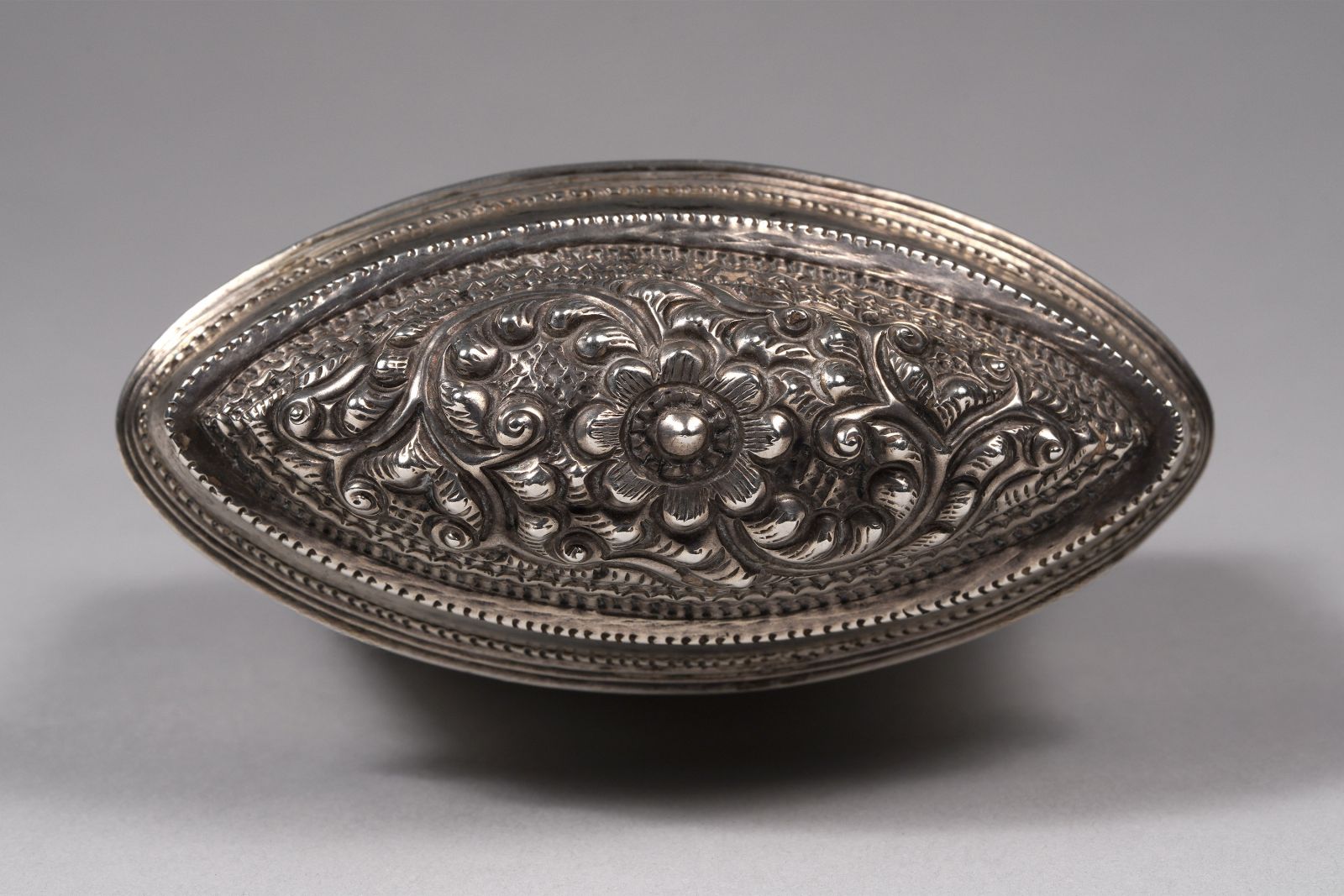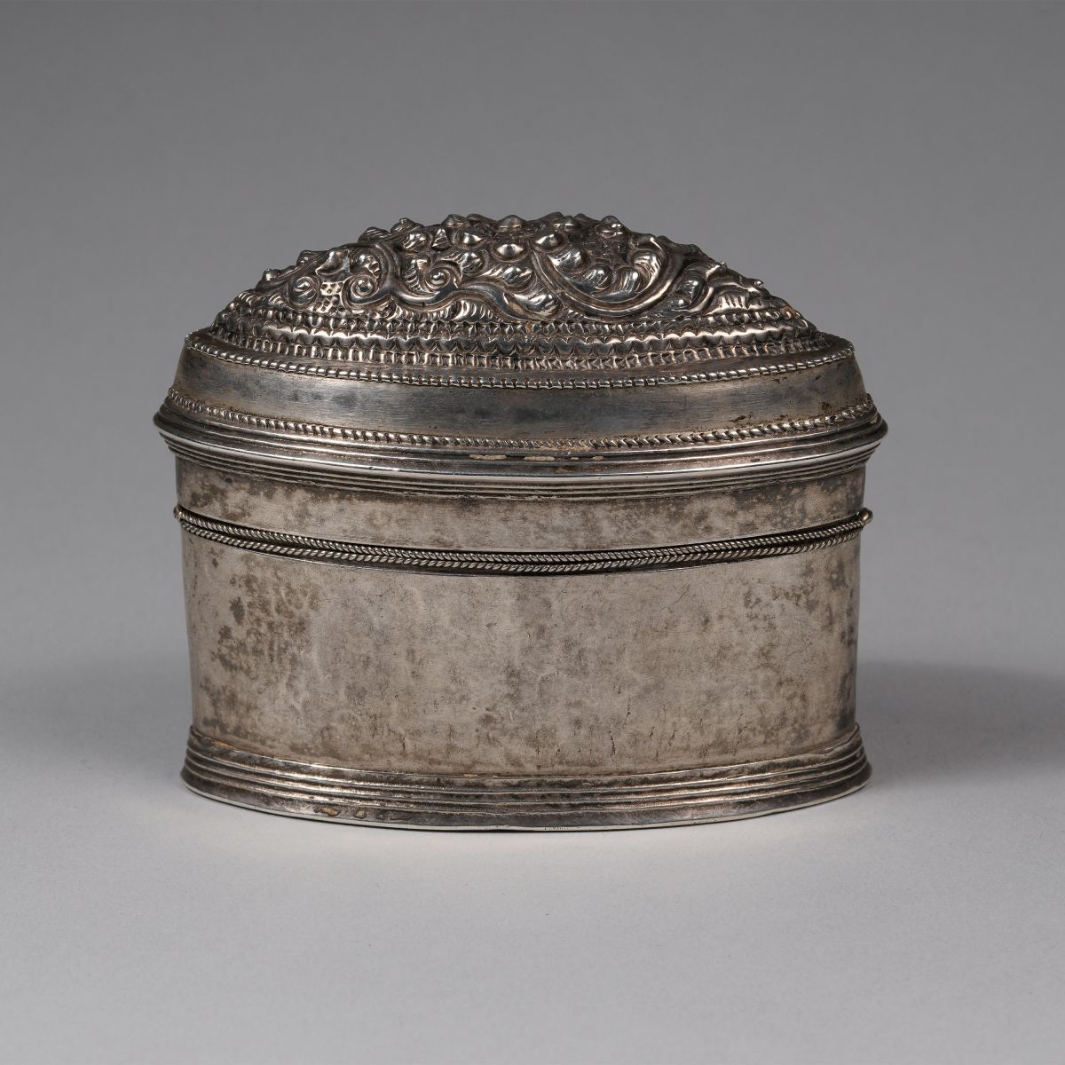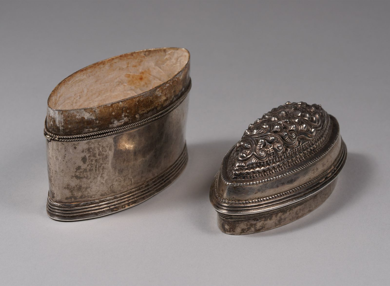 Oval Shape Hton Bu, silver lime box with 8 petaled flower, and leaf decorations.