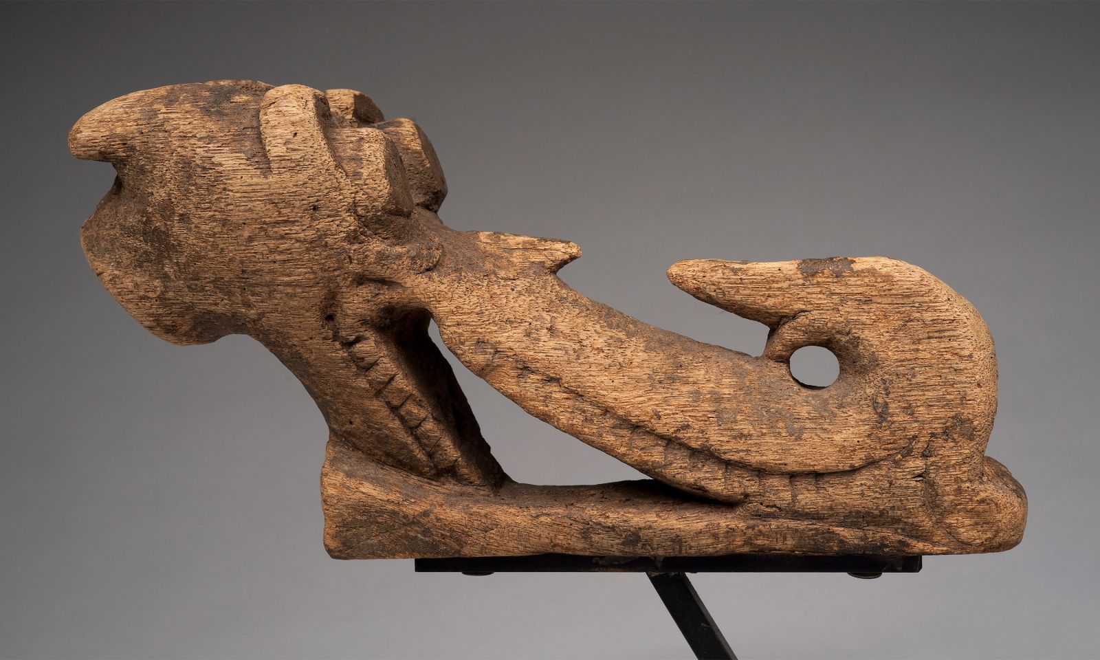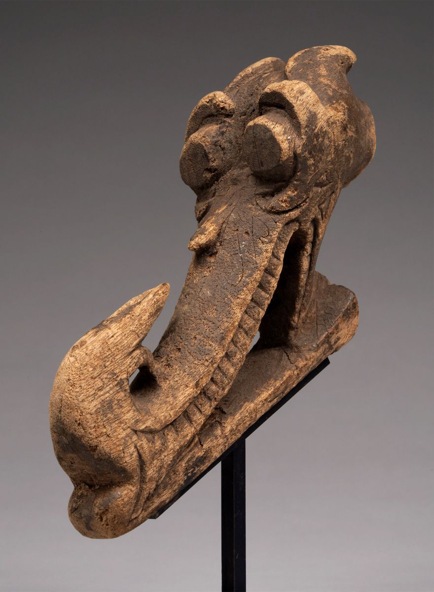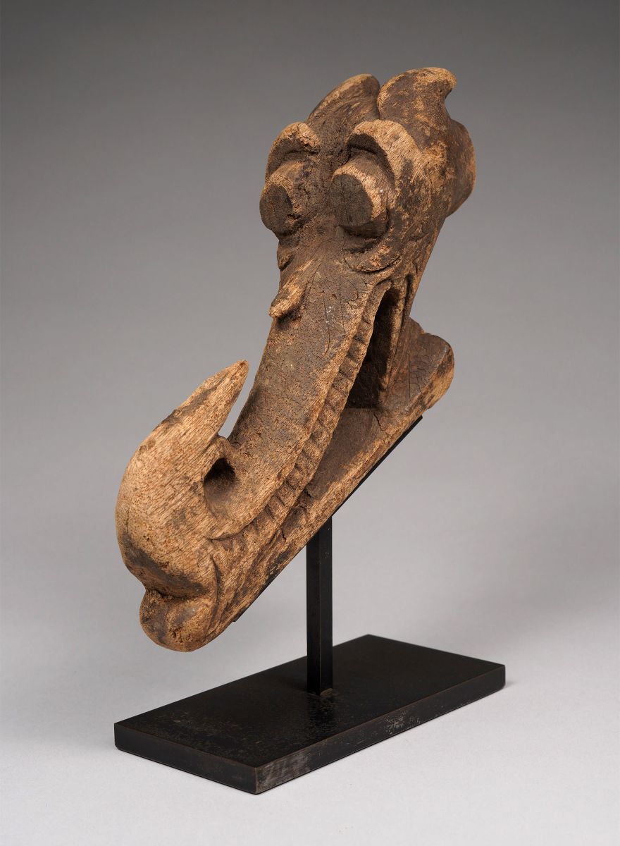 Vigorously carved head of an Aso, a mythological beast that was kept as an inspired template for future work.