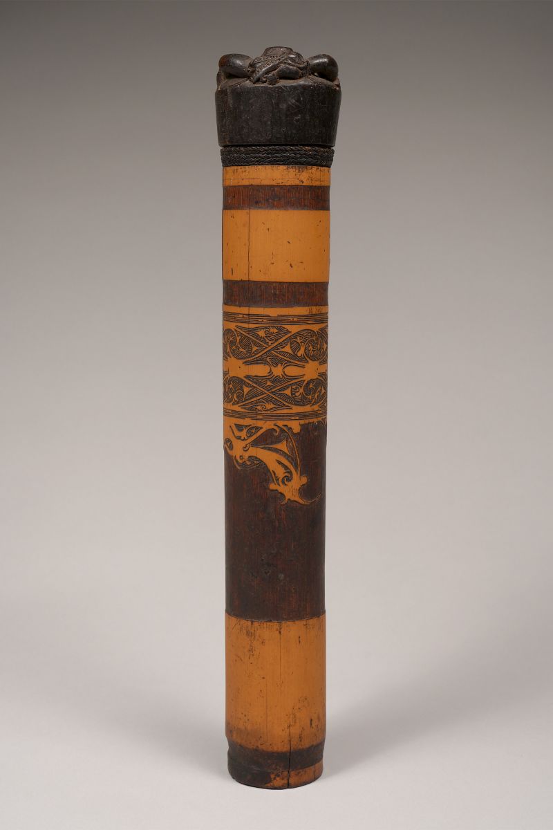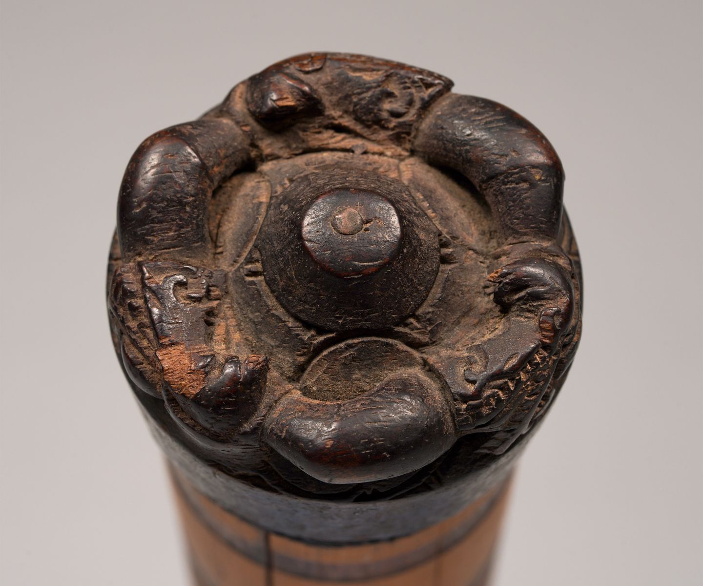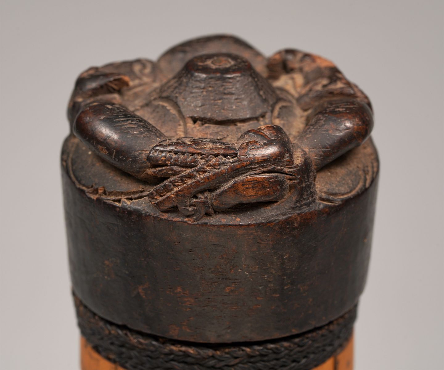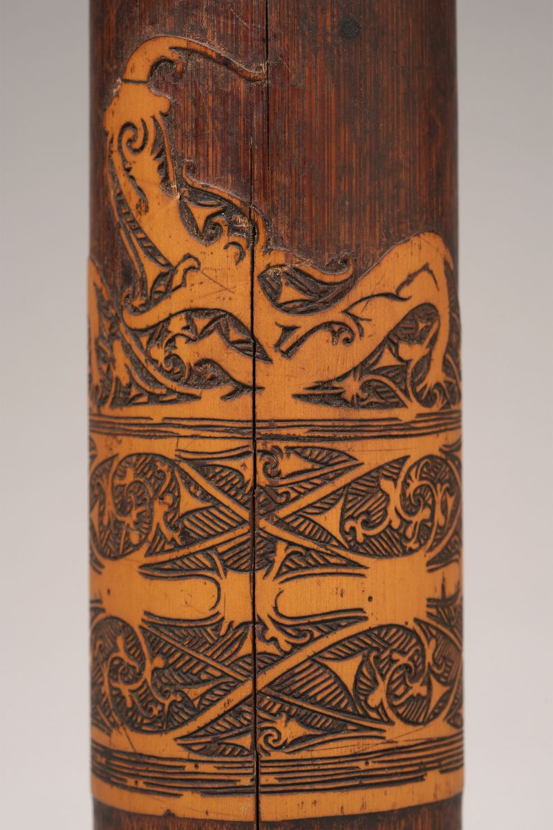 Elegantly detailed Bamboo with carved wooden stopper of intertwining toothy beasts.