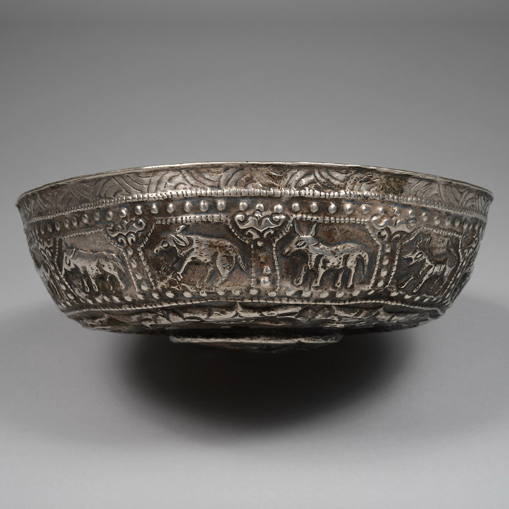 Once the decorative cover for the under portion of a wood turned bowl, the silver base is embossed in repoussé technique. Naively rendered with primitive interpretations of animals associated with the zodiac. Each animal is contained within a cartouche surrounded by jewels. At the base is an elephant carrying the three precious gems (Triratna) surrounded by the Eight Auspicious Symbols (Ashtamangala).